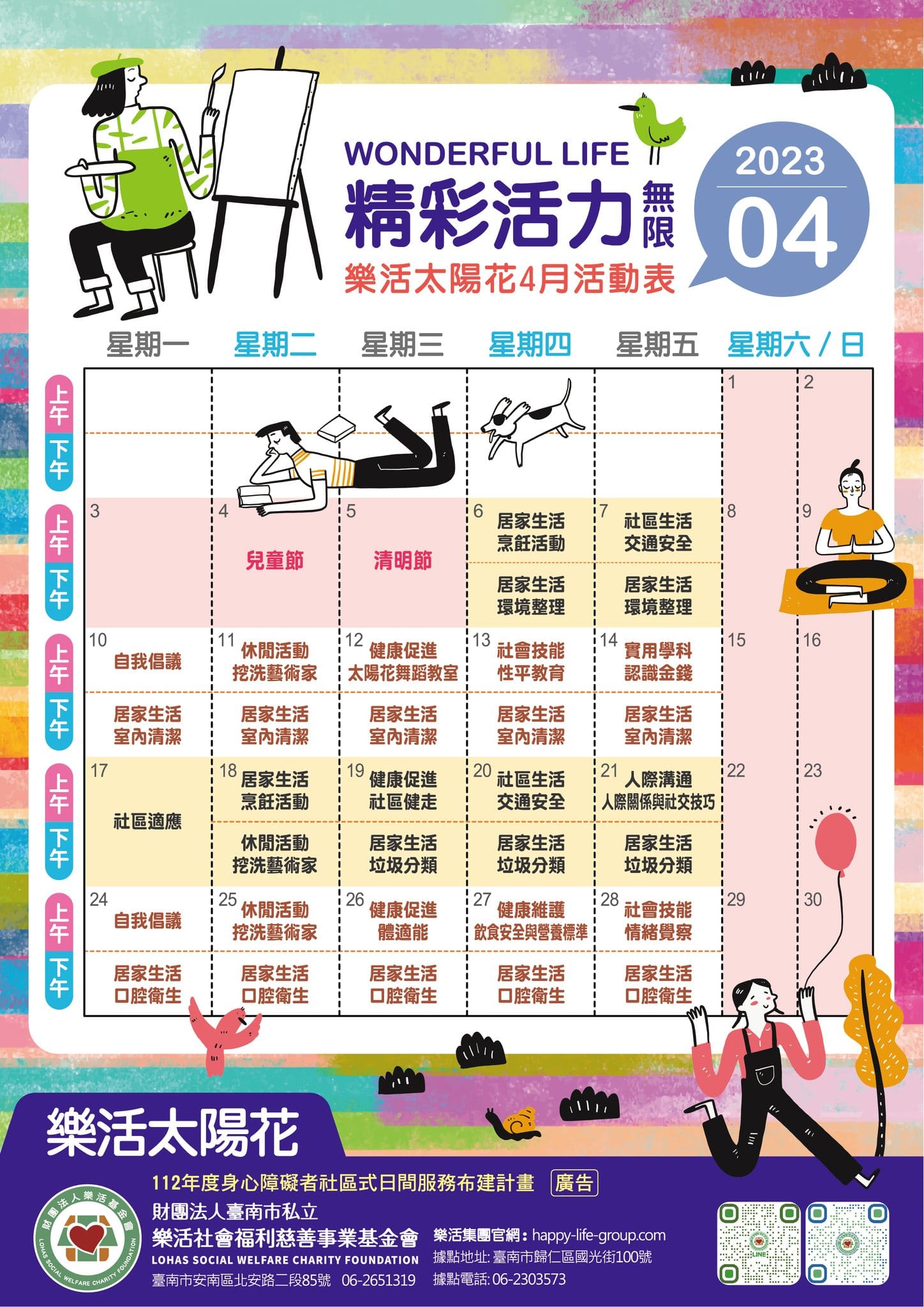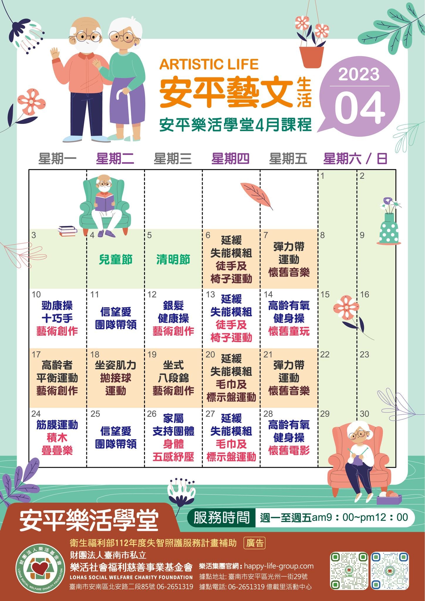 安平樂活學堂四月份的課程出爐囉運動健身藝術創作音樂治療認知活動懷舊系列信望愛團隊的活動帶領 本月開始延緩模組開…