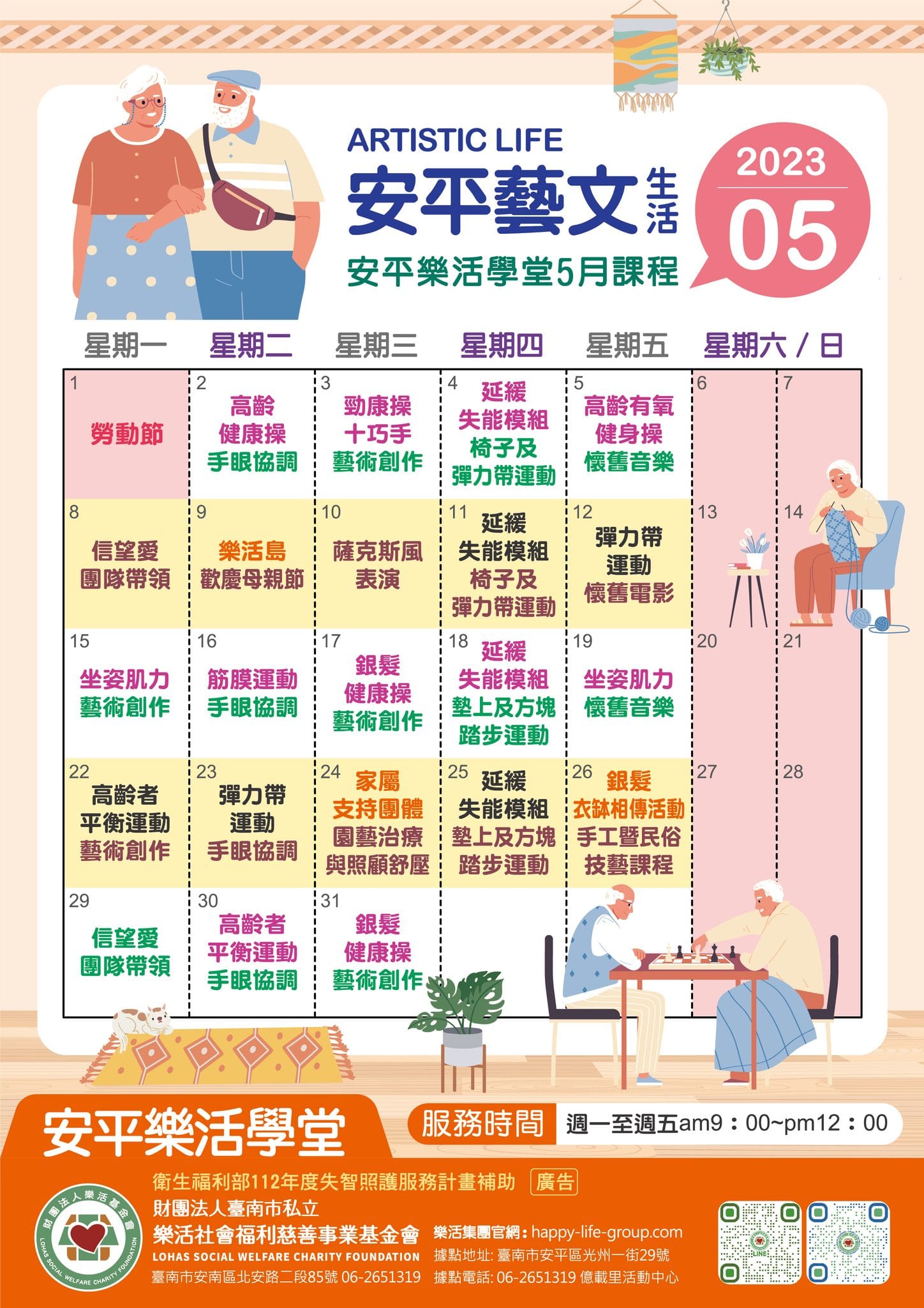 安平樂活學堂 五月份的課程出爐囉 運動健身 藝術創作 音樂治療 認知活動 懷舊系列 信望愛團隊的活動帶領 延緩…
