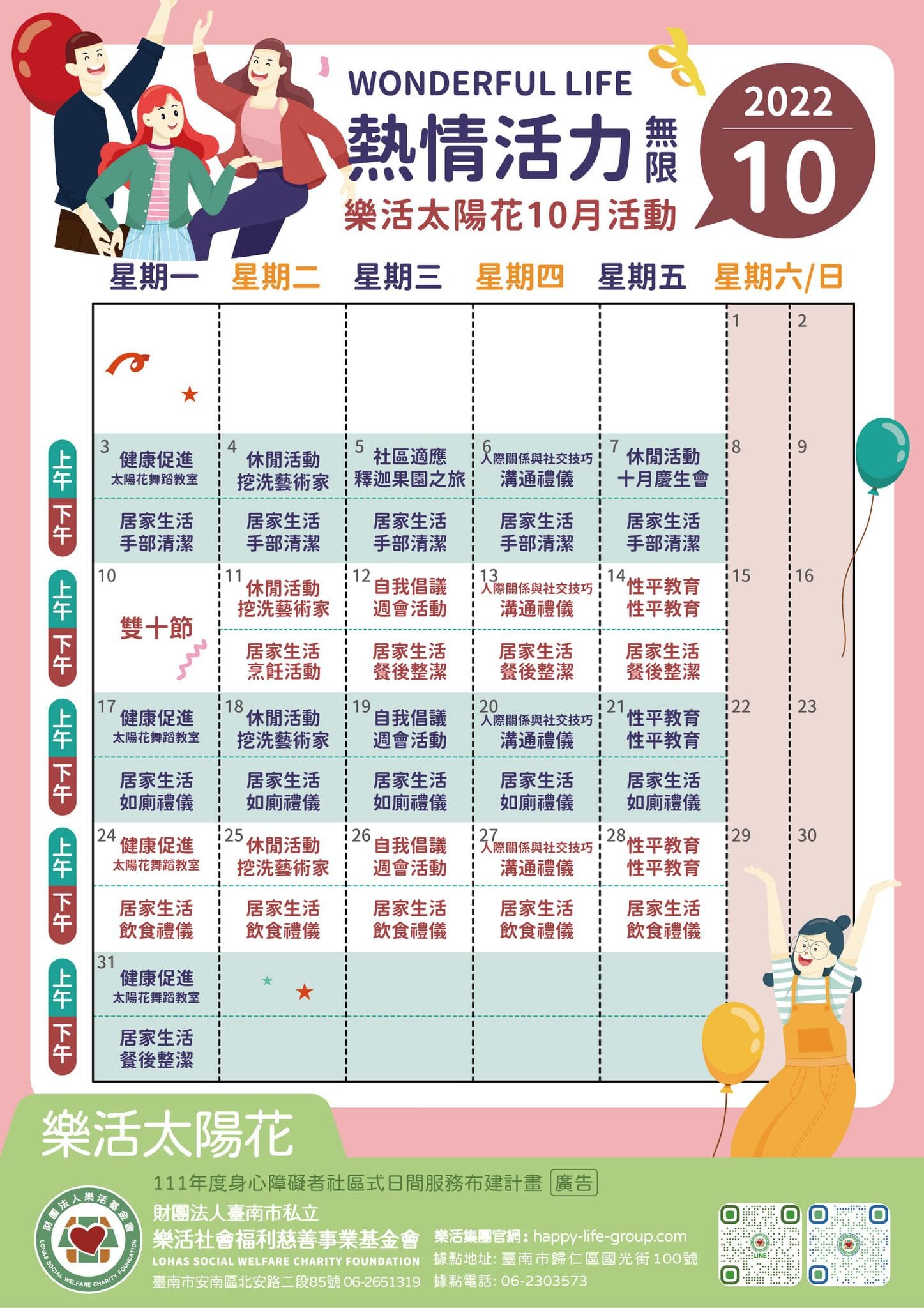 樂活太陽花 十月份的活動出來囉~ 有各式各樣豐富的活動 居家生活、休閒活動、體能活動、成長團體等豐富的活動 快…