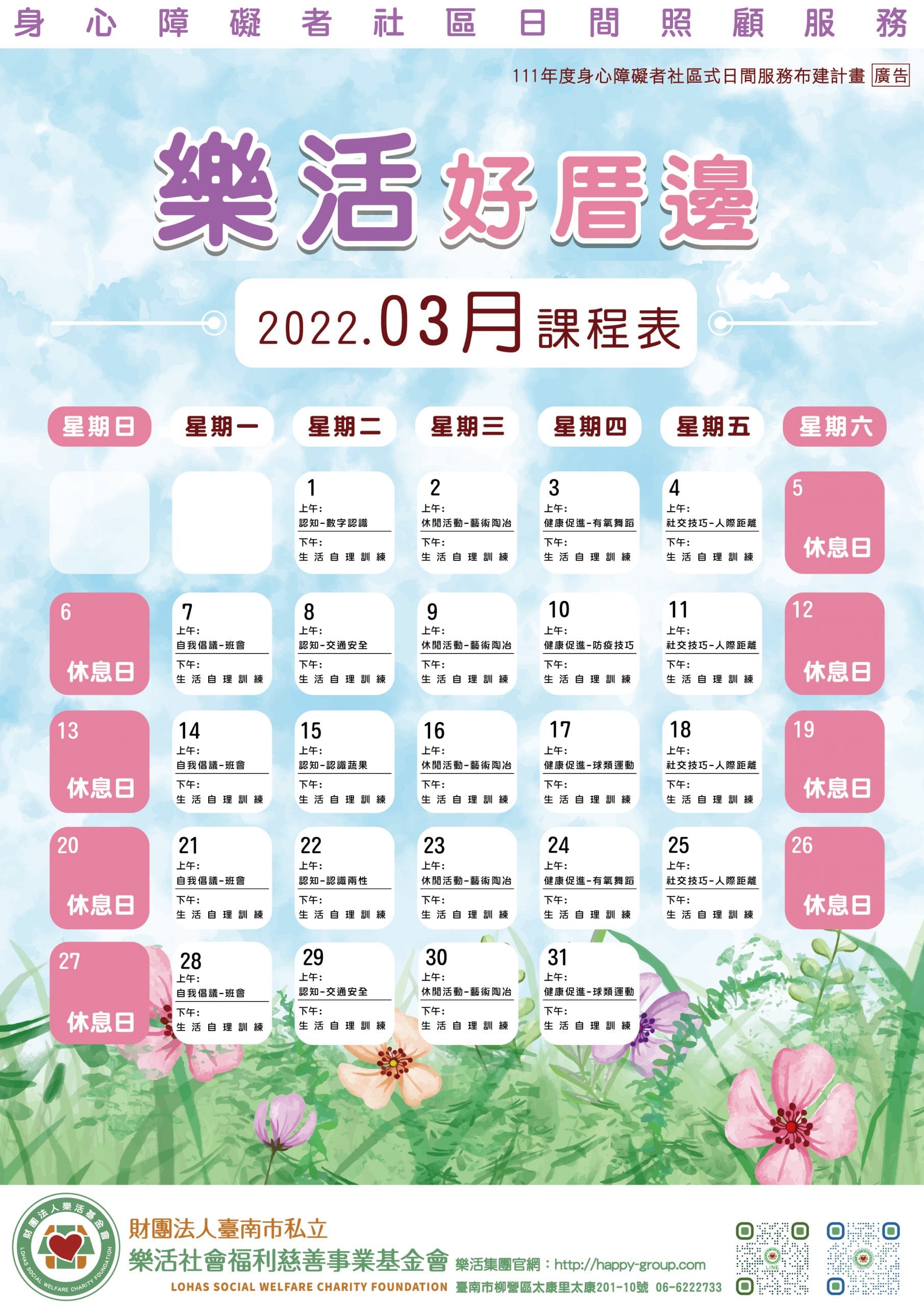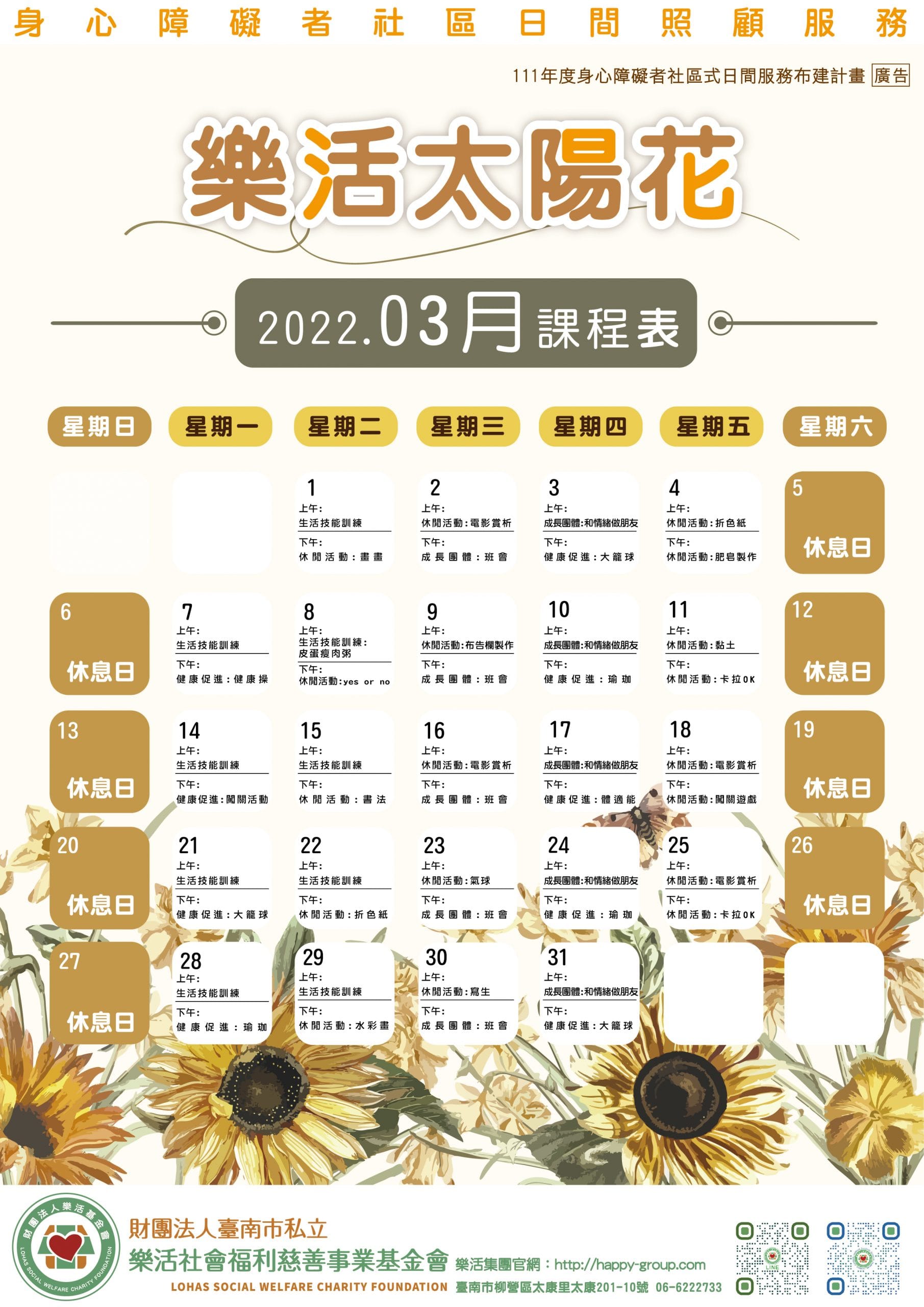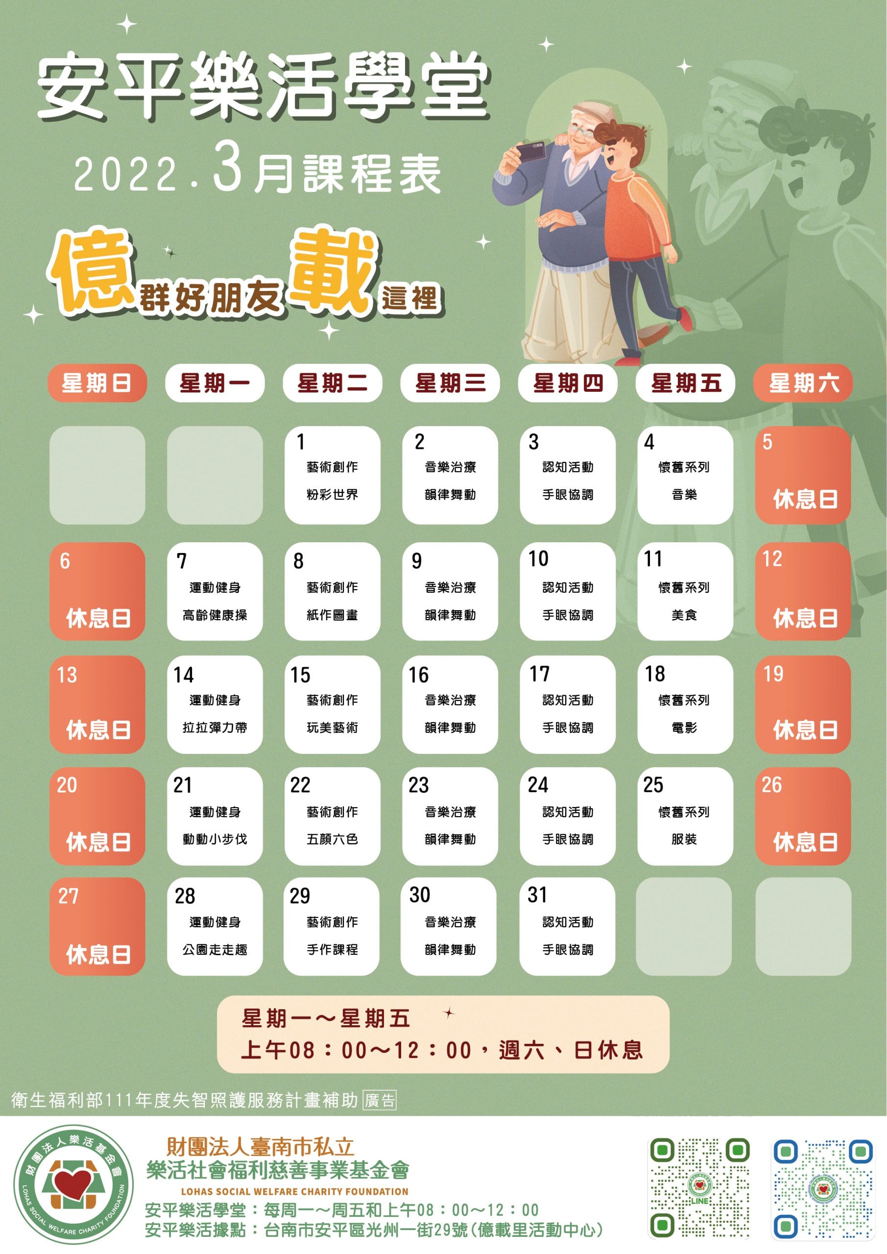 安平樂活學堂的億群好朋友 三月份的課程出爐囉 運動健身 藝術創作 音樂治療 認知活動 懷舊系列 活動安排多樣化…