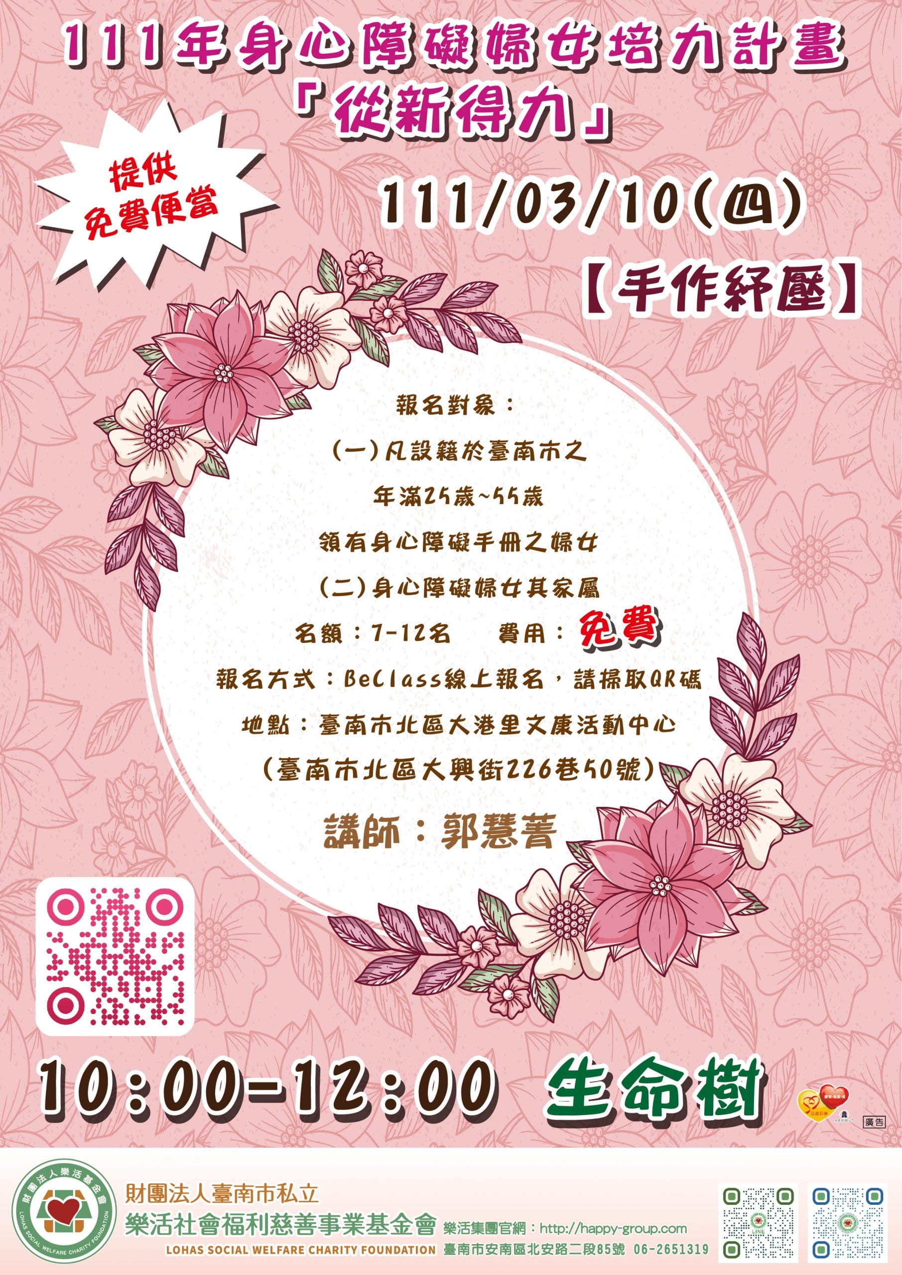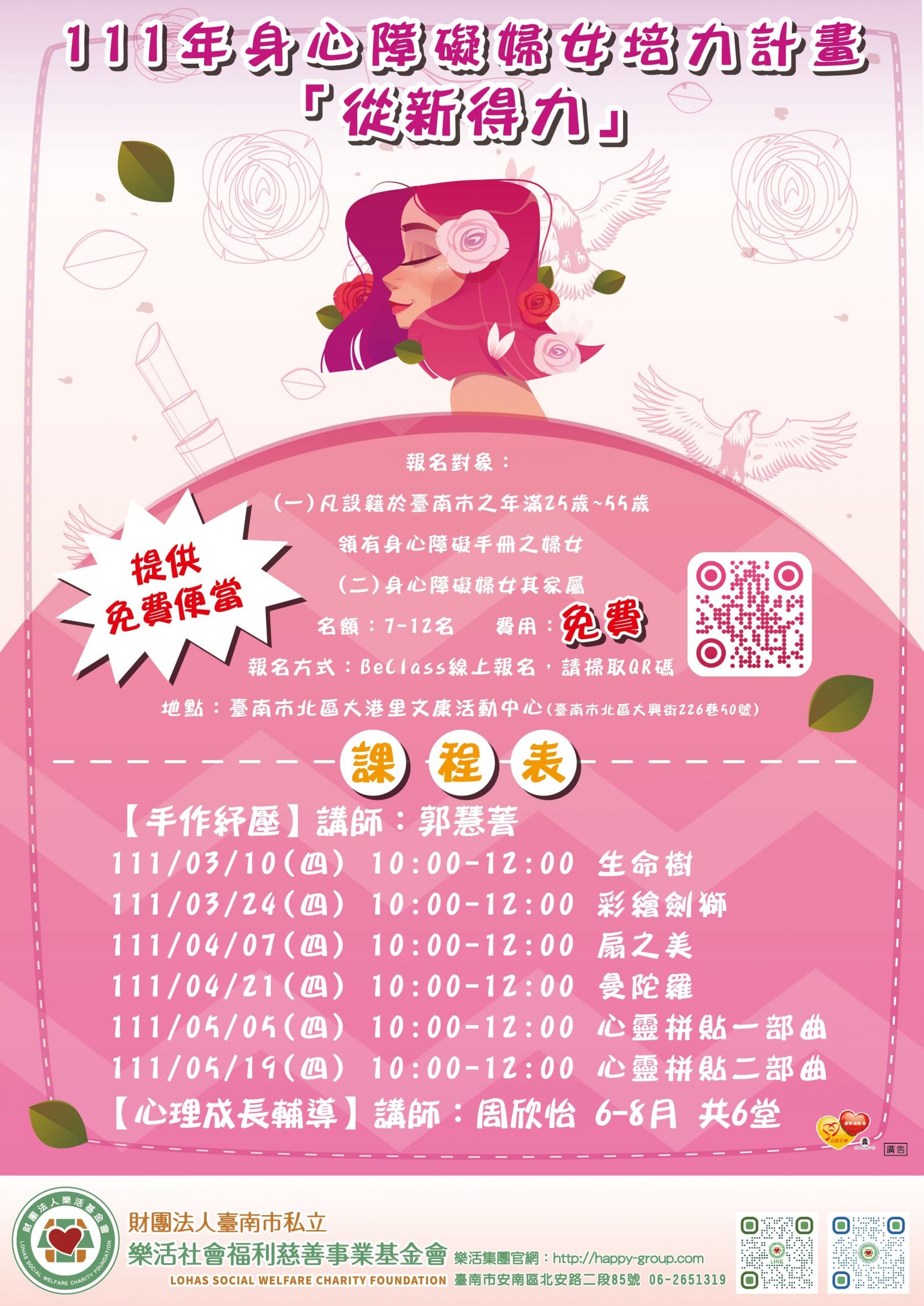 為了提升身心障礙婦女 認知能力 生理能力 情感狀態能力 社會互動能力 服務對象 凡設籍於台南市之年滿25歲~5…