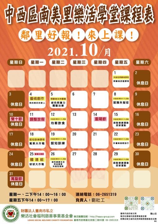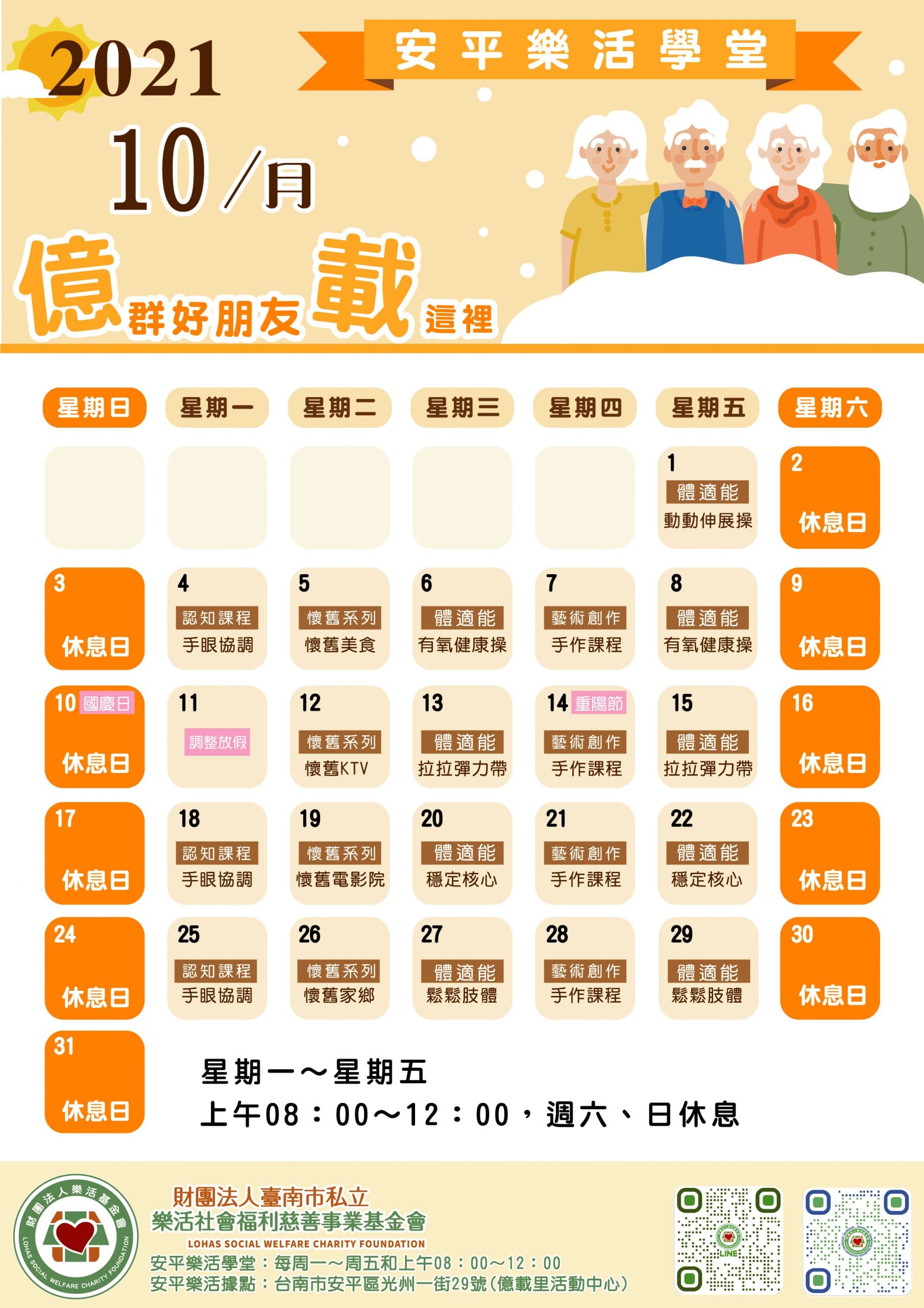 安平樂活學堂的億群好朋友 10月份課表~活動非常豐富喔~ 歡迎大家相聚在一起~ 安平失智據點依COVID-19…