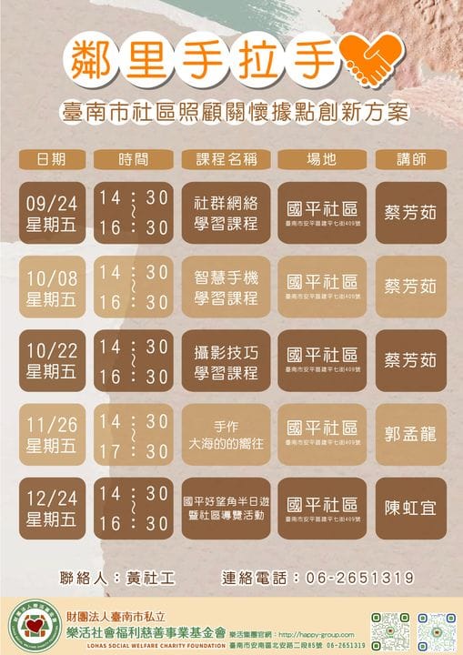 國平里的課程表終於出爐囉 對手機、攝影、社群有興趣之朋友 都可以來上課唷課程完全免費 #鄰里手拉手-台南市社區…