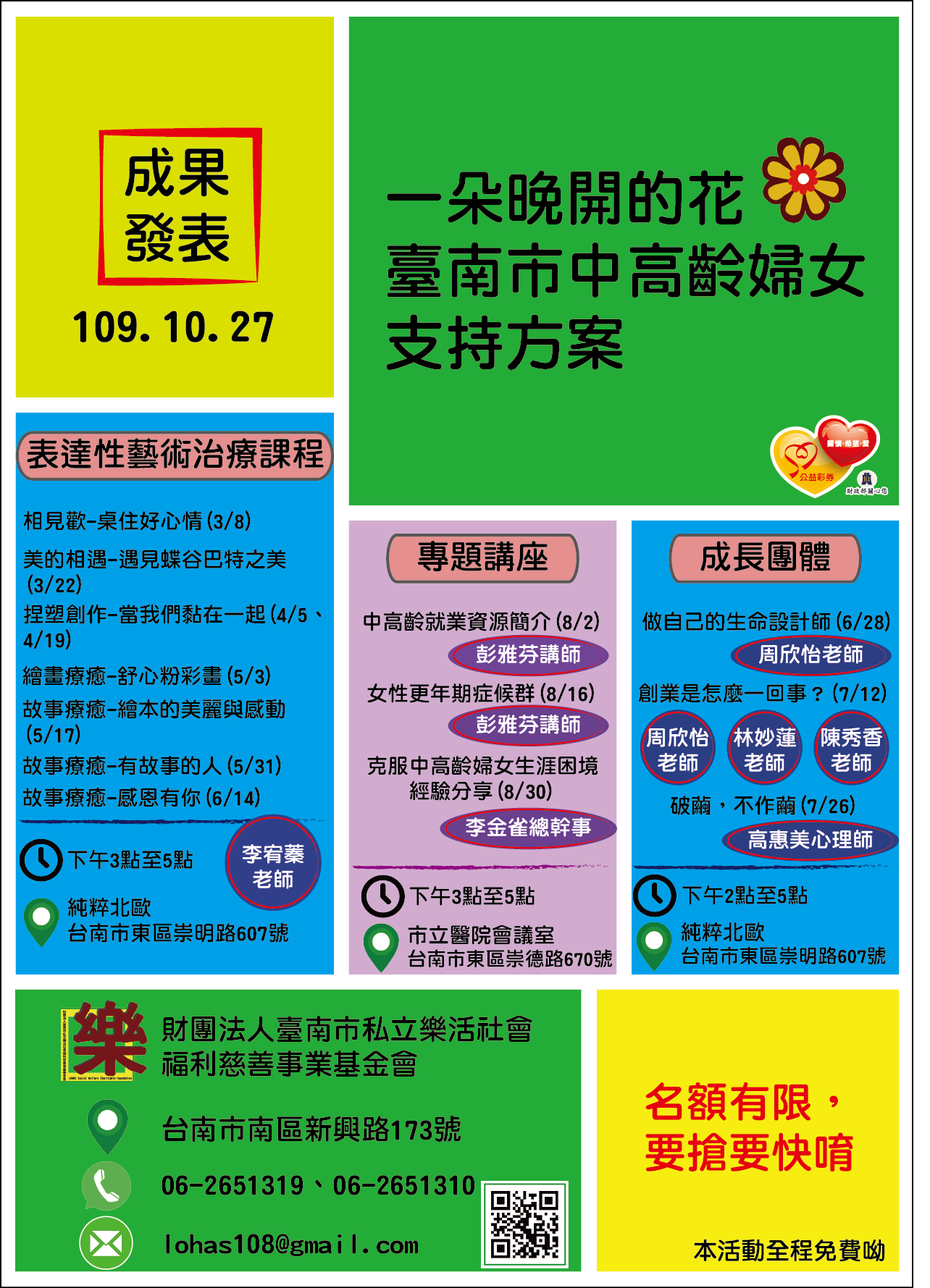 主題:「一朵晚開的花-臺南市中高齡婦女支持方案」開辦啦! 分類:活動資訊 內文: 一、 活動簡介 …