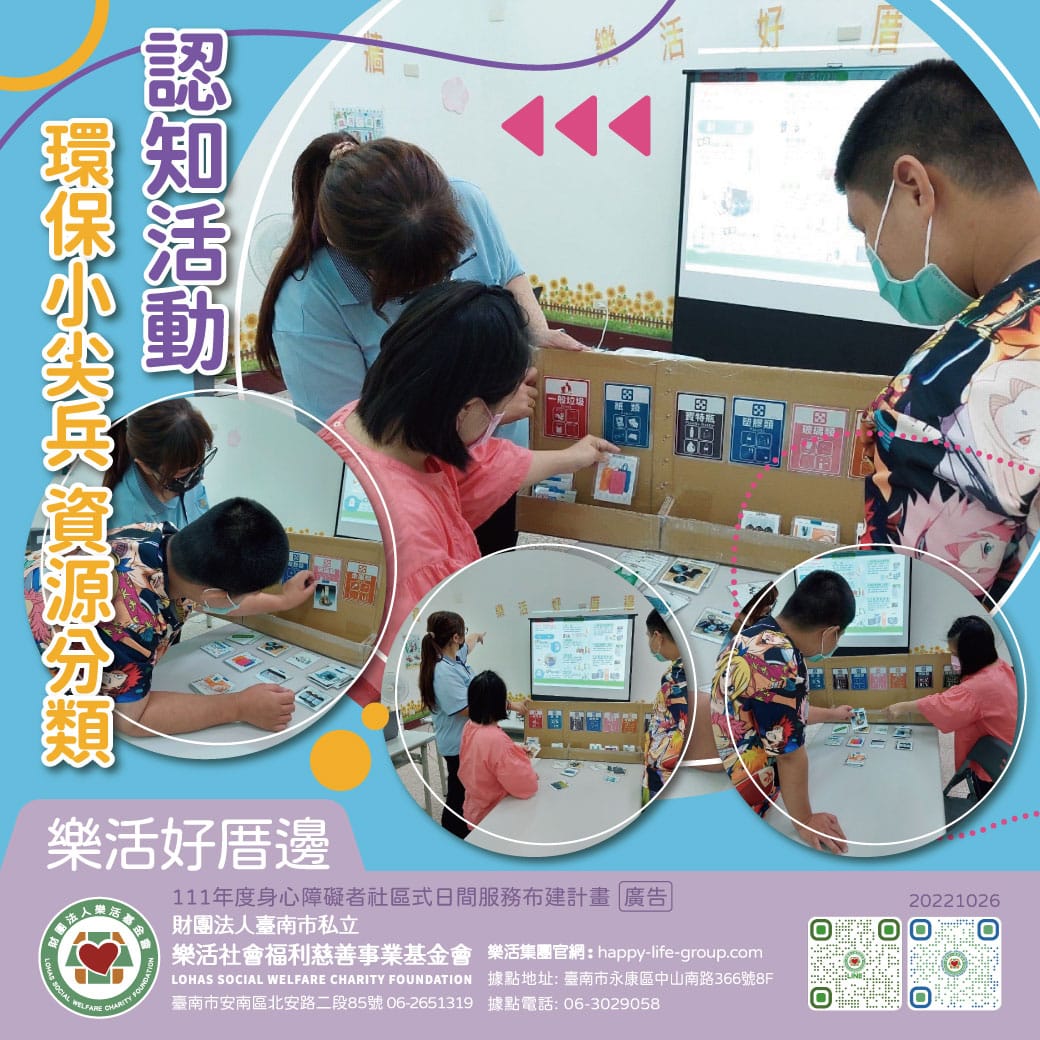 樂活好厝邊持續招生中 認知活動-資源分類 智青在樂活好厝邊專業工作人員的引導下 練習將正確的垃圾進行分類 辨識…