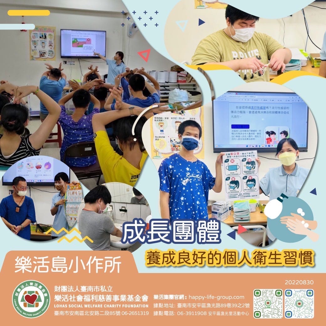 成長團體養成良好的個人衛生習慣不管是吃東西前、上廁所後、做代工後、咳嗽打噴嚏後都應「勤洗手」確實用肥皂洗手且減…