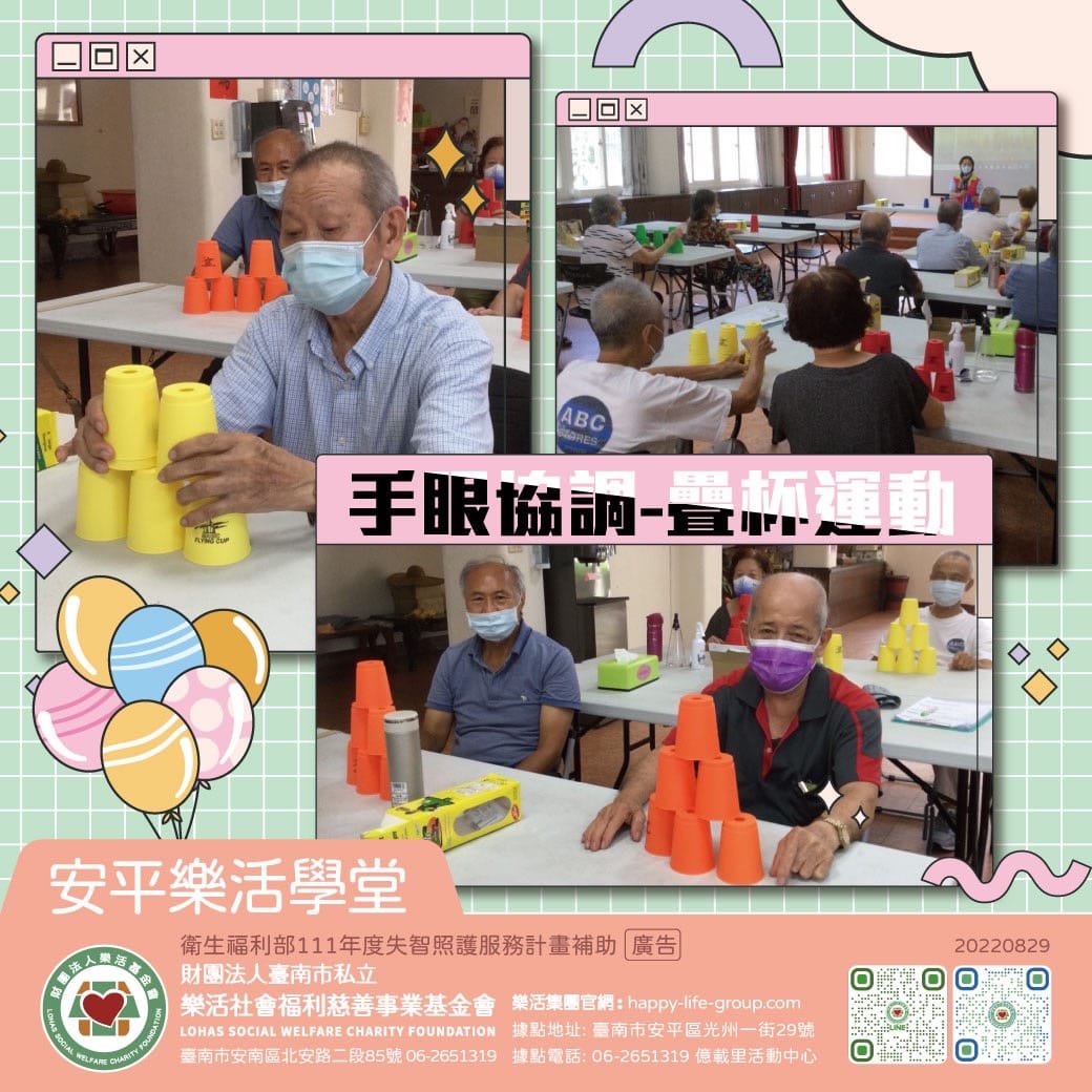 安平樂活學堂【手眼協調-疊杯運動】透過堆疊杯子幫助長者正確的使用手及眼睛使杯子能夠正確地放在對的角度上往上堆疊…