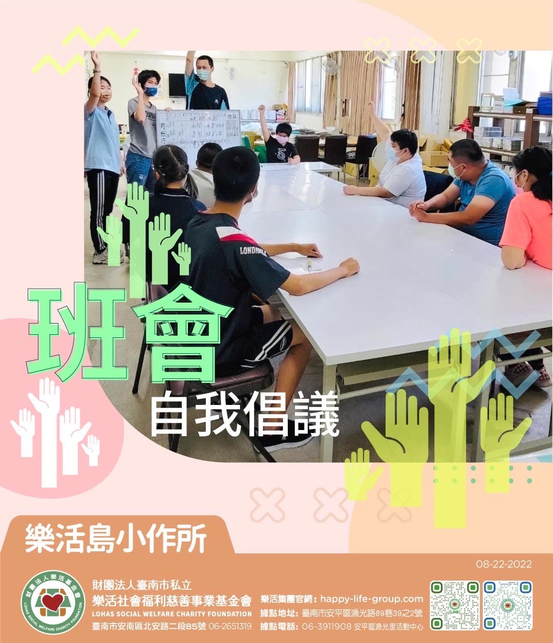 咦~今天是什麼活動怎麼一群人聚在一起 手又舉的那麼高好像是在投票 原來是樂活島小作所的班會活動每個月一次的樂活…