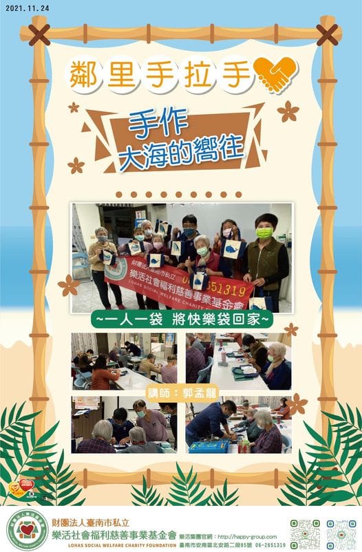 11月是手作月 以安平的特色為主題來設計 今天是平通里的朋友們感謝大家熱情的參與 手作-粉彩海洋 透過手的韻染…