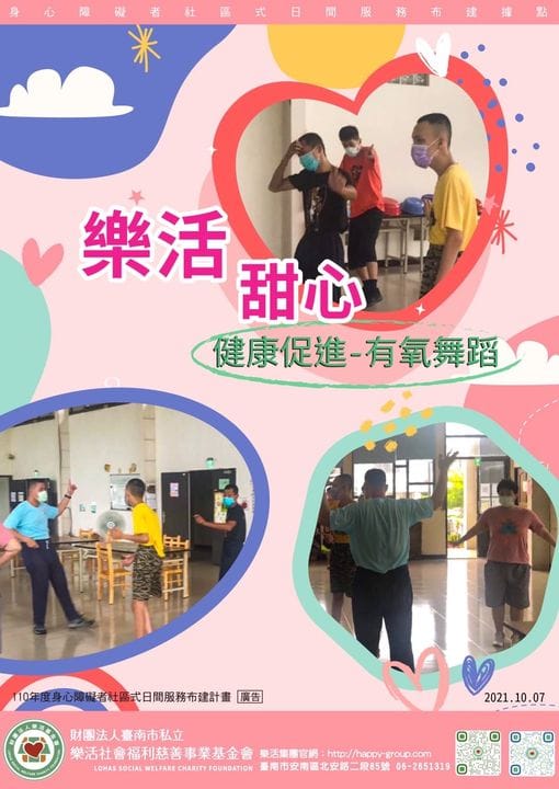 一起來動次動次動~樂活甜心的專業工作人員們帶領夥伴們一起運動, 維持良好的身體機能,樂活甜心關心夥伴們的身體健…
