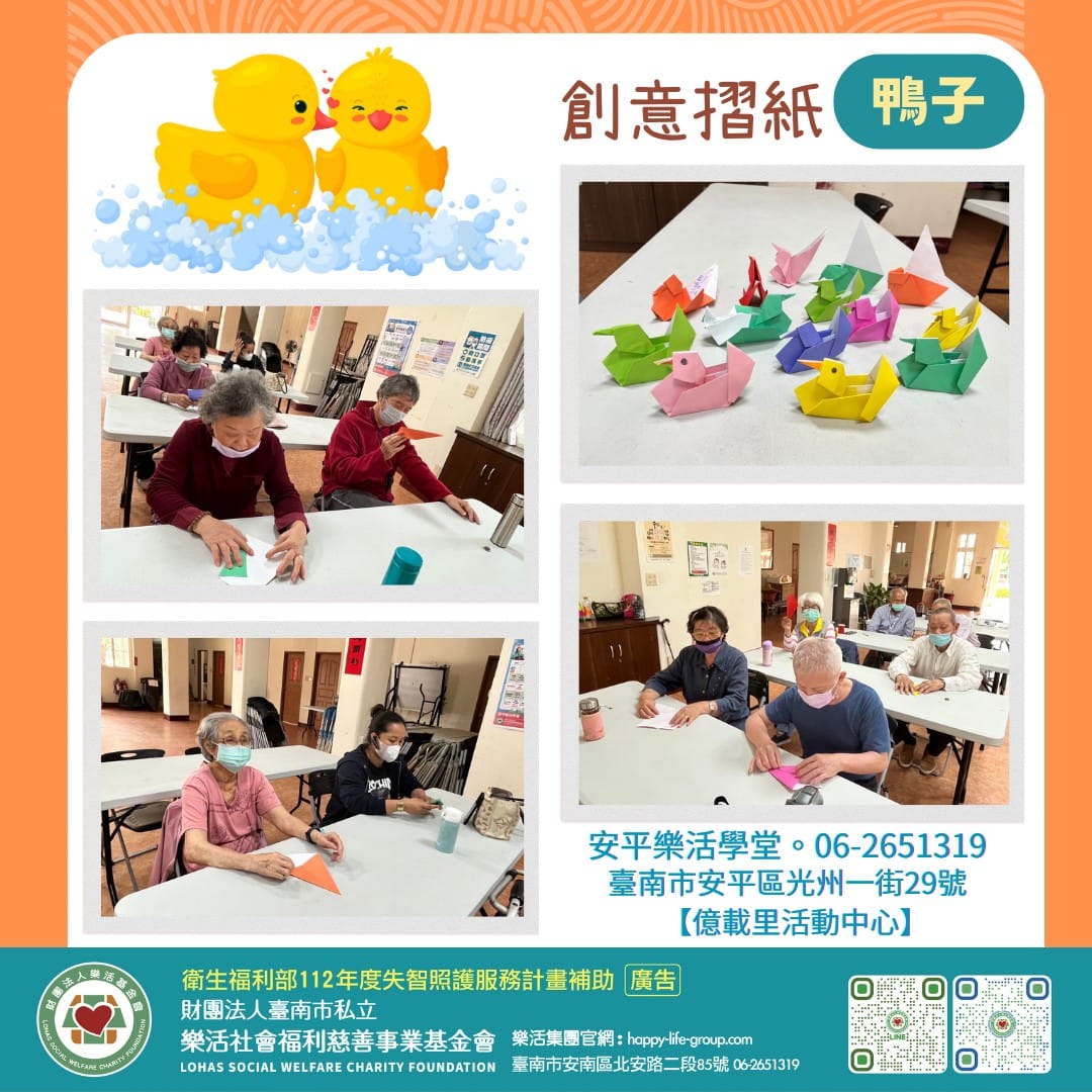 安平樂活學堂 【創意摺紙-鴨子】 五彩繽紛的鴨子 一隻一隻誕生 透過社工一個步驟一個步驟的帶領 大家都做得很有…
