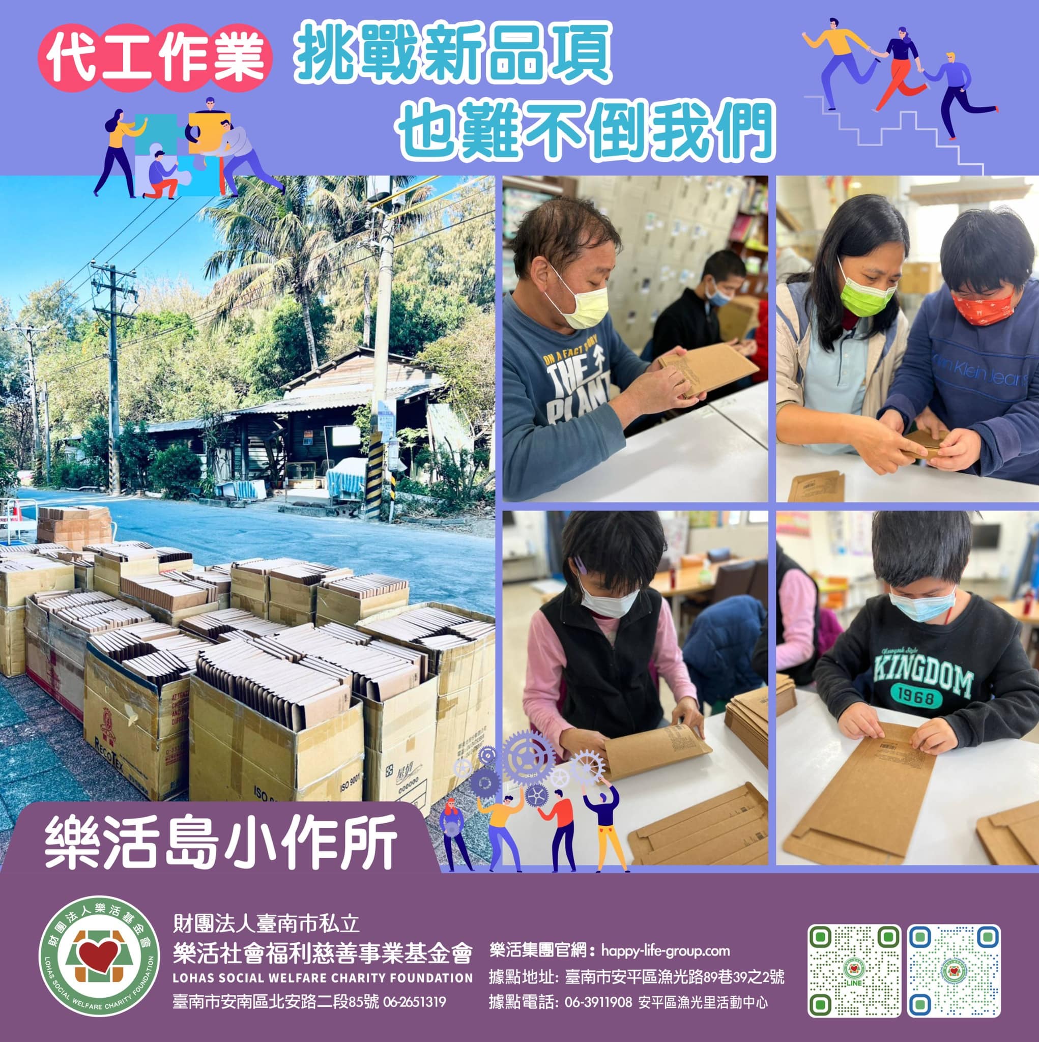 樂活島小作所 邀你一起來快樂學習 樂活島的青年是最棒的一群! 代工作業 依著智青的能力給予訓練,隨著這些日子工…