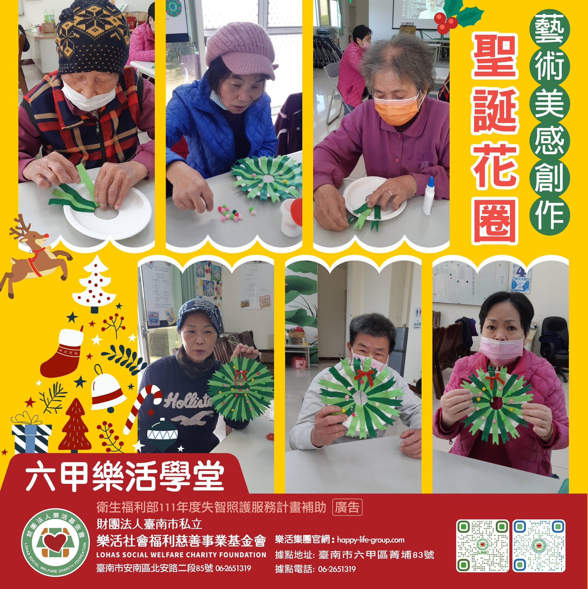 六甲樂活學堂 【 藝術美感創作-聖誕花圈】 藉由紙盤將一條條淺綠和深綠黏貼在紙盤上,繞成一圈後,變成聖誕花圈,…