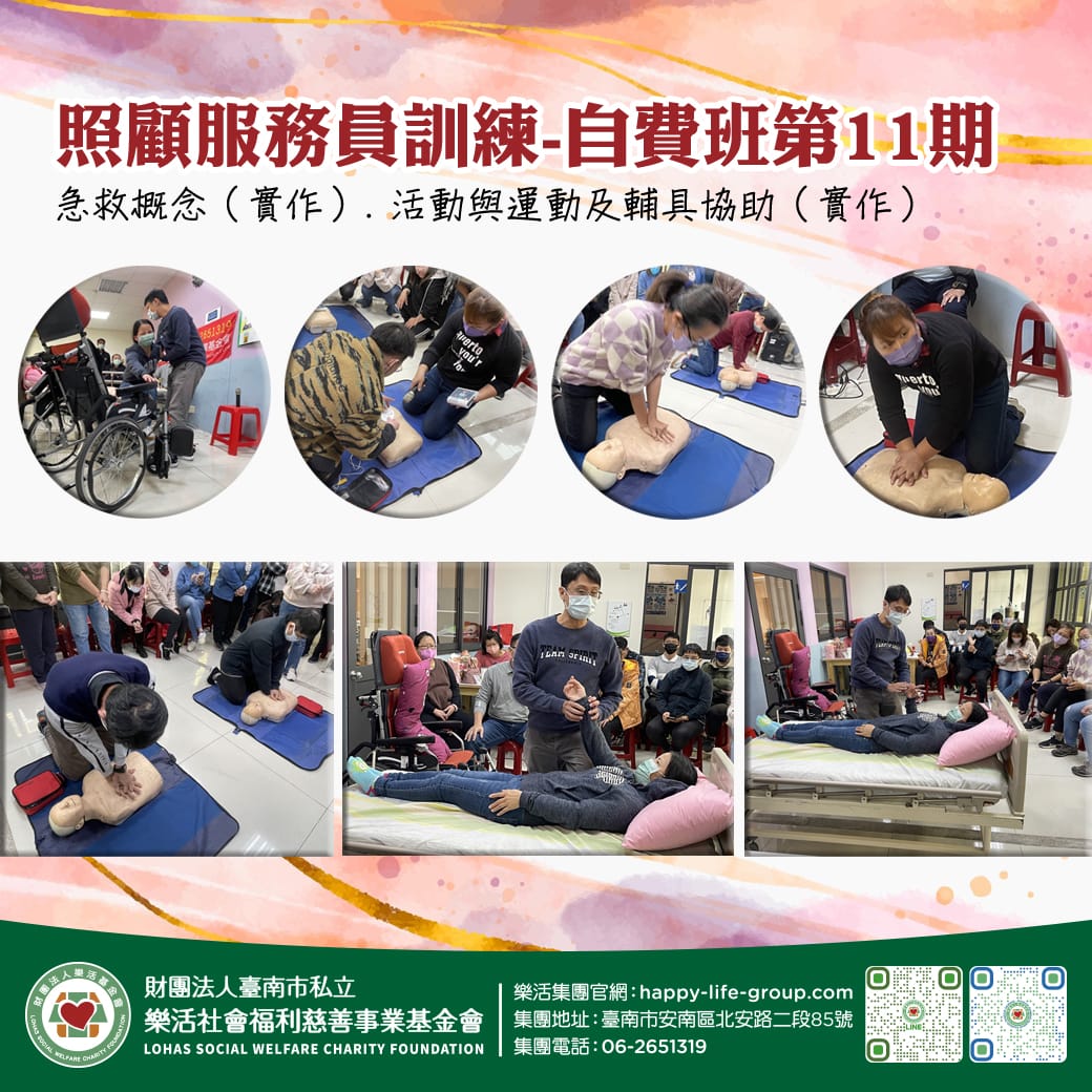 照服員專班第11期 第二天上實作課程 上了急救概念與活動與運動及輔具協助 學員們都很認真的學習 cpr練習時,…