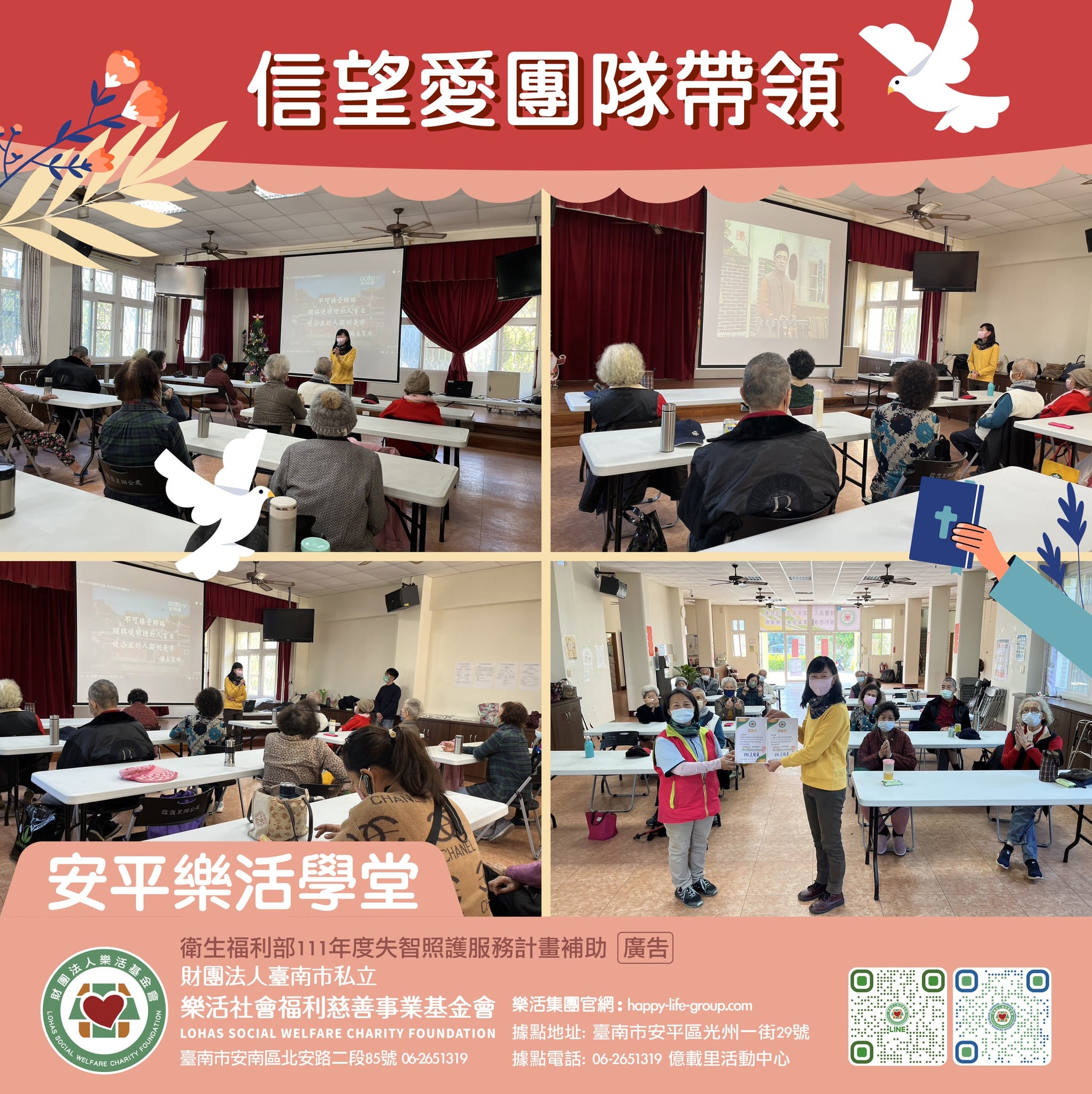安平樂活學堂 【信望愛團隊】 今天是信望愛團隊 今年的最後一次帶領活動 教導學習如何變老 教導怎麼過老年生活 …