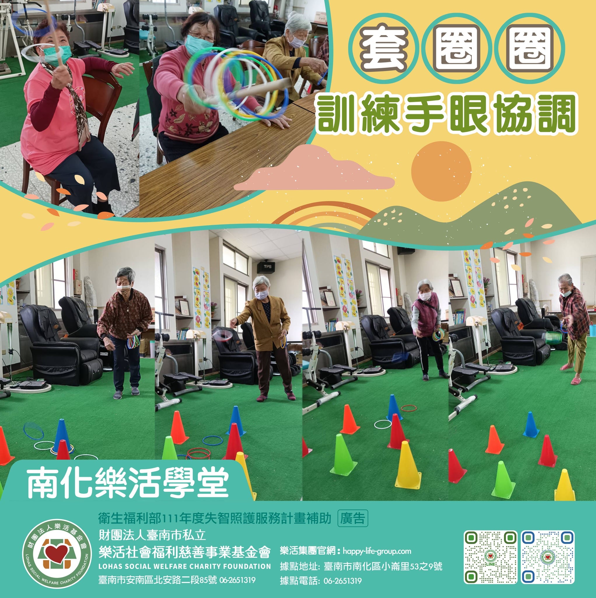 【套圈圈-手眼協調】 一開始發給長輩一人一支棒子,原本要傳遞圈圈環,沒想到長輩自己玩起了棒子呼拉圈,從一個圈圈…