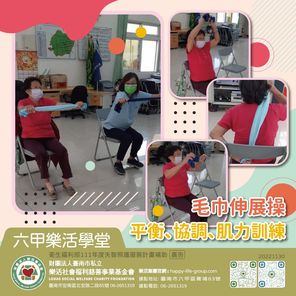 六甲樂活學堂 {坐姿運動/毛巾伸展操} 透過此運動鍛鍊到全身骨頭 透過一些肢體動作來活動全身關節 透過毛巾彈力…