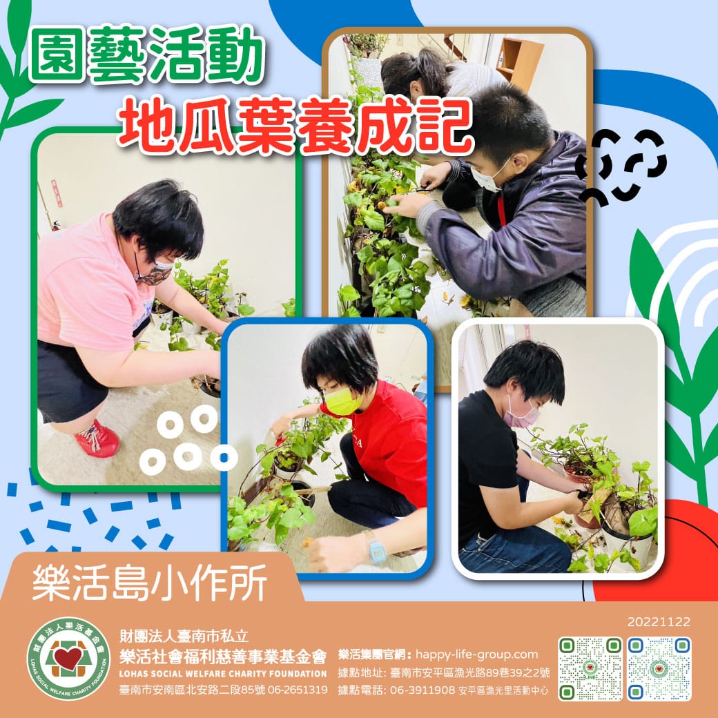 樂活島小作所 地瓜葉養成記 智青一日農夫上線中 我們的地瓜葉在智青細心和護下已經成長茁壯 今天讓智青將枯葉修剪…