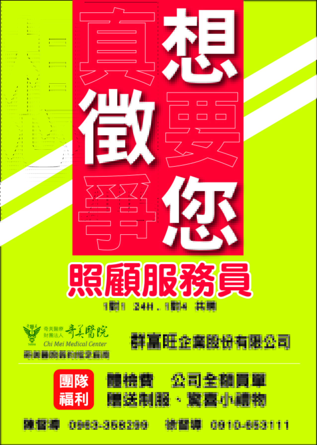 【群富旺人力看護中心】開始徵才囉! 公告, 最新消息By happylifegroup29 6 月, 2020奇美醫院特約看護中心(永康奇美及柳營奇美) 群富旺人力看護中心自109年7月16日 開始進駐 全力徵才中~~歡…