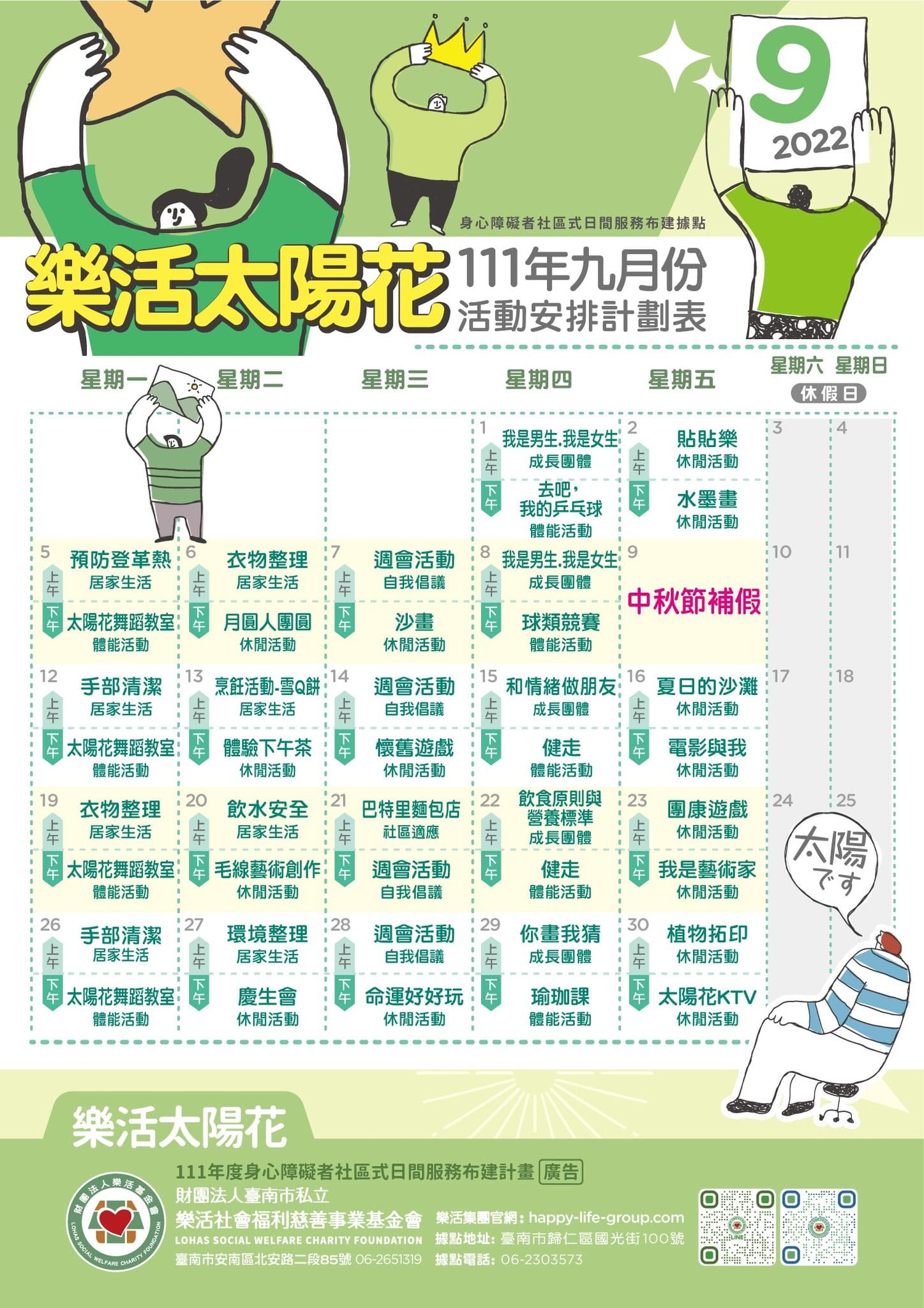 樂活太陽花 樂活太陽花9月的活動出來啦~~各式各樣豐富多元的活動:休閒活動、成長團體、體能活動、居家生活等多個…