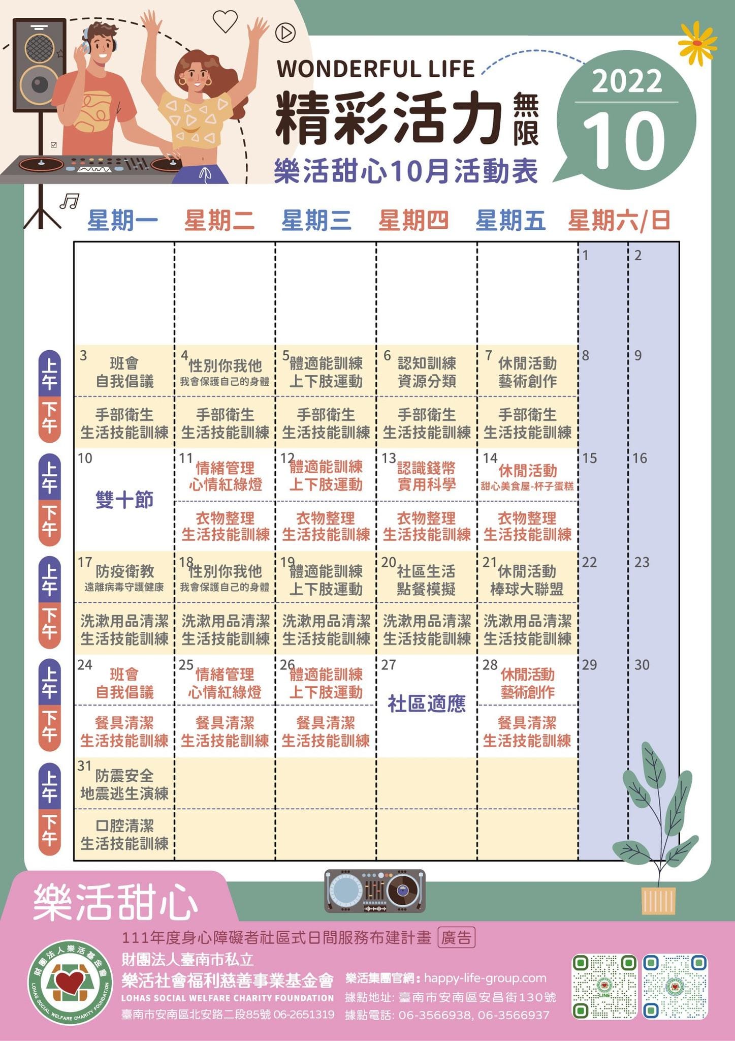 樂活甜心布建身心障礙者社區日間照顧服務 精彩活力無限的十月活動表出爐囉 有手部衛生、衣物整理、洗漱用品清潔及餐…