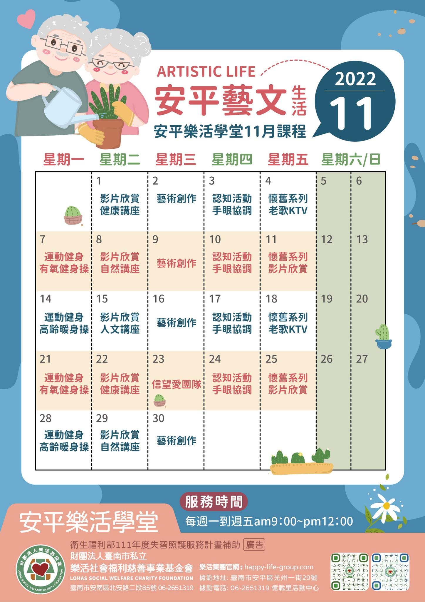 安平樂活學堂 十一月份的課程出爐囉 運動健身 藝術創作 音樂治療 認知活動 懷舊系列 信望愛團隊的活動帶領 豐…