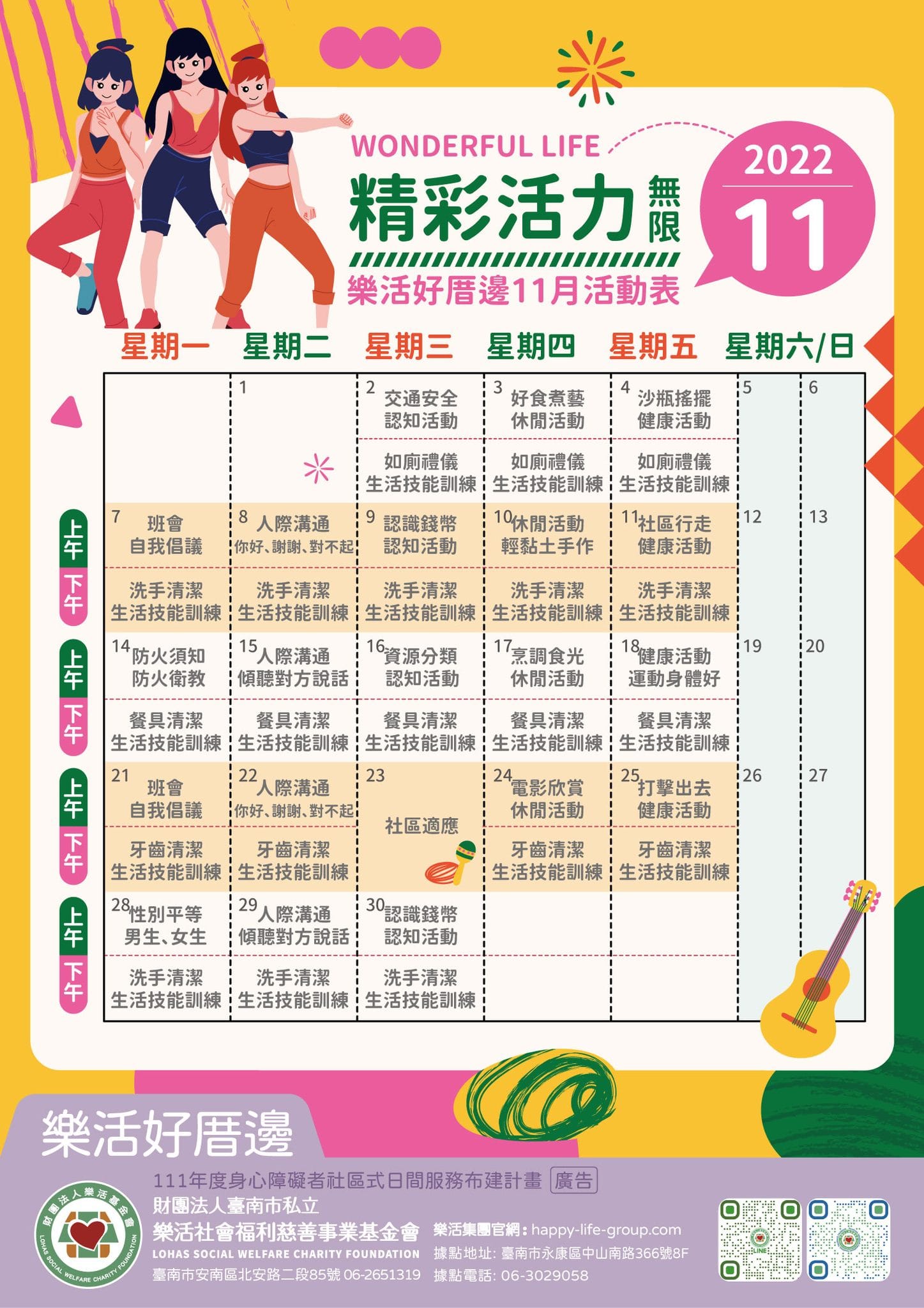 11月活動表熱騰騰出爐啦~ 樂活好厝邊持續招生中 智青喜歡的動手烹飪活動增加為兩次唷 邊學習各種食材與器具的用…