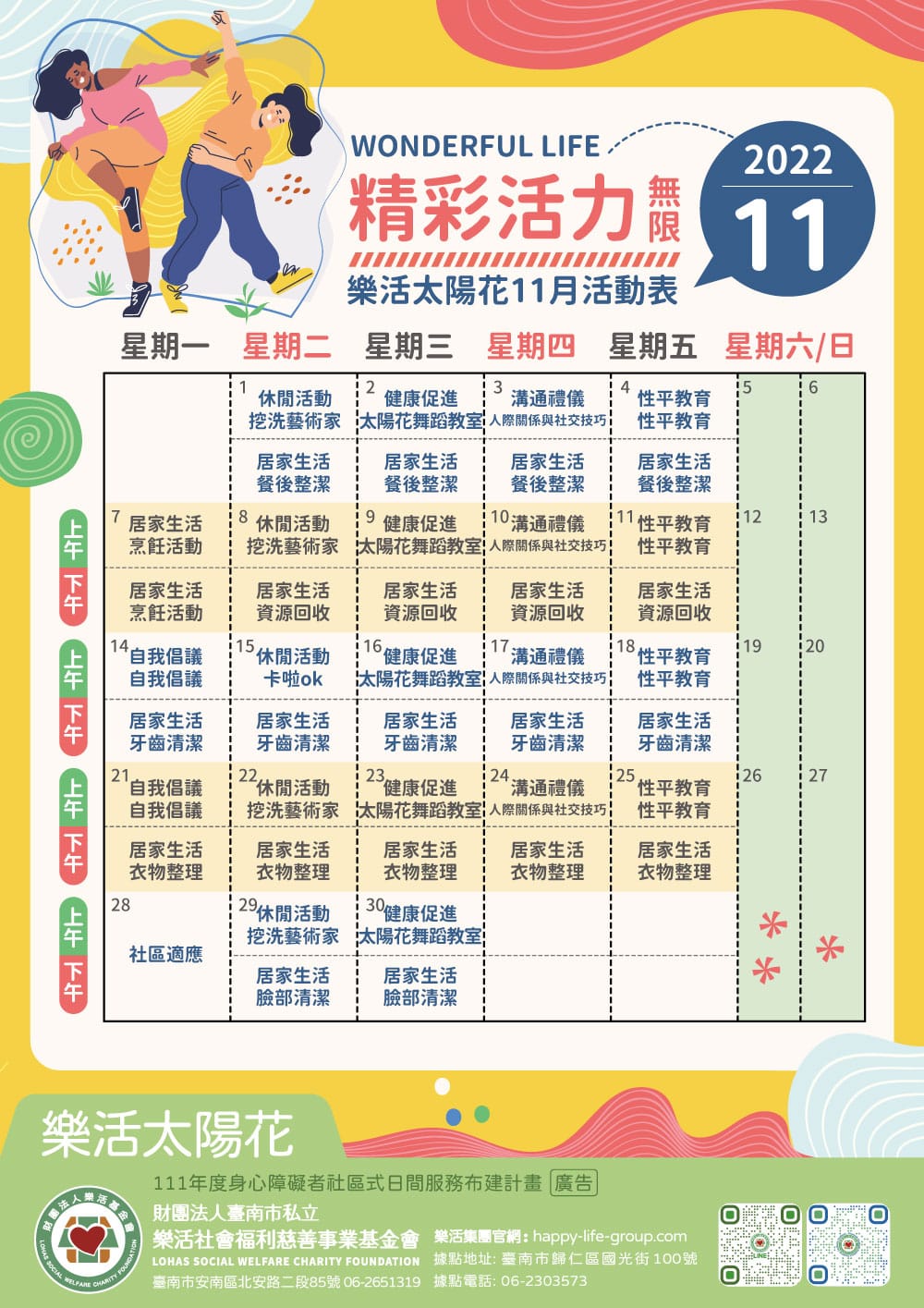 樂活太陽花 樂活太陽花11月的活動出來啦~~ 各式各樣豐富多元的活動:自我倡議、休閒活動、人際關係與社交技巧、…