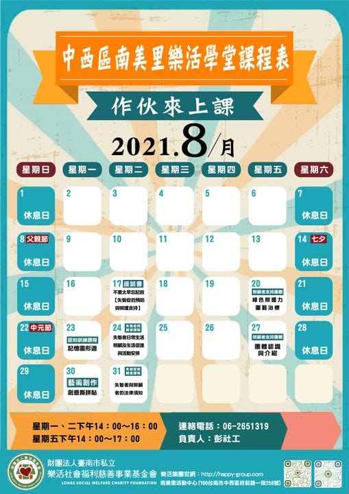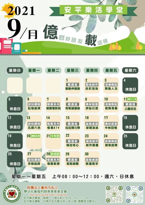 安平樂活學堂的億群好朋友 9月份的課表熱騰騰的出來囉 我們的活動安排非常豐富 認知課程 藝術創作 素材創意 益…