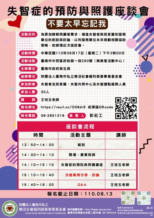 當家中的失智症患者遺忘你時,心中有許多無奈及悲傷。 但不用擔心 我們開辦了 失智症的預防與照護座談會 有專業的…