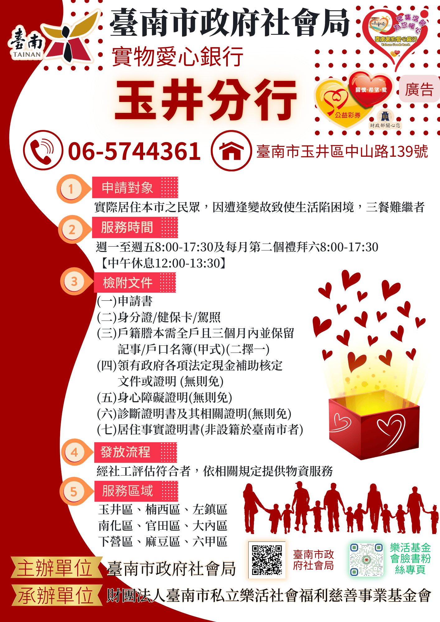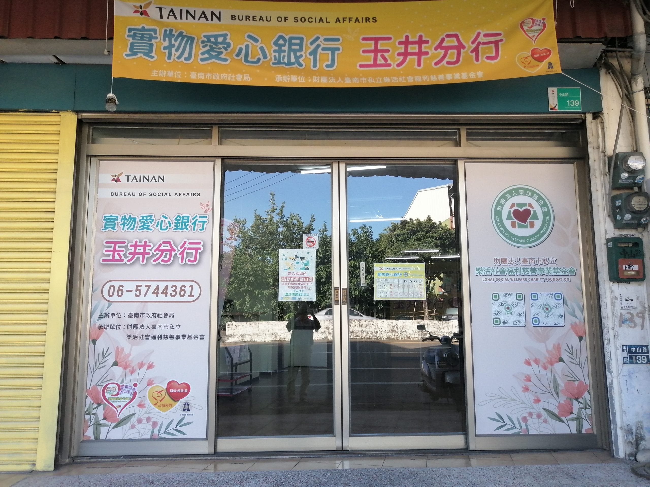 臺南市實物愛心銀行-玉井分行開幕於111年05月28日,屬於社會局實物愛心銀行實物給付實施計畫。藉由各界善心人士的物資捐助來幫助弱勢家庭或個人,為其做急難紓困。
