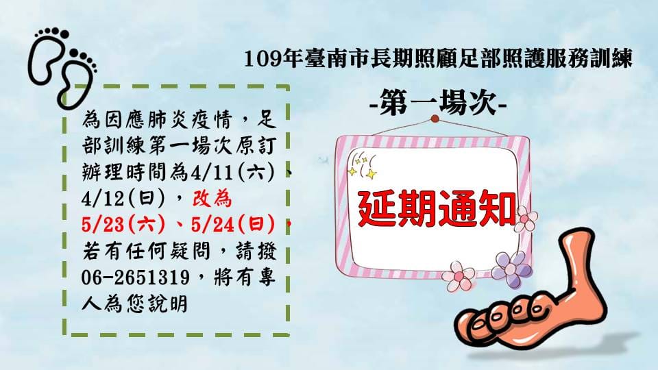 3 月312020基金會活動資訊及訓練課程置頂公告活動訊息 為因應肺炎疫情,足部照護訓練課程第一場次原訂4/11(六)~4/12(日)延至5/23(六)~5/24(日)第二場次、第三場次暫依原訂時間辦理。